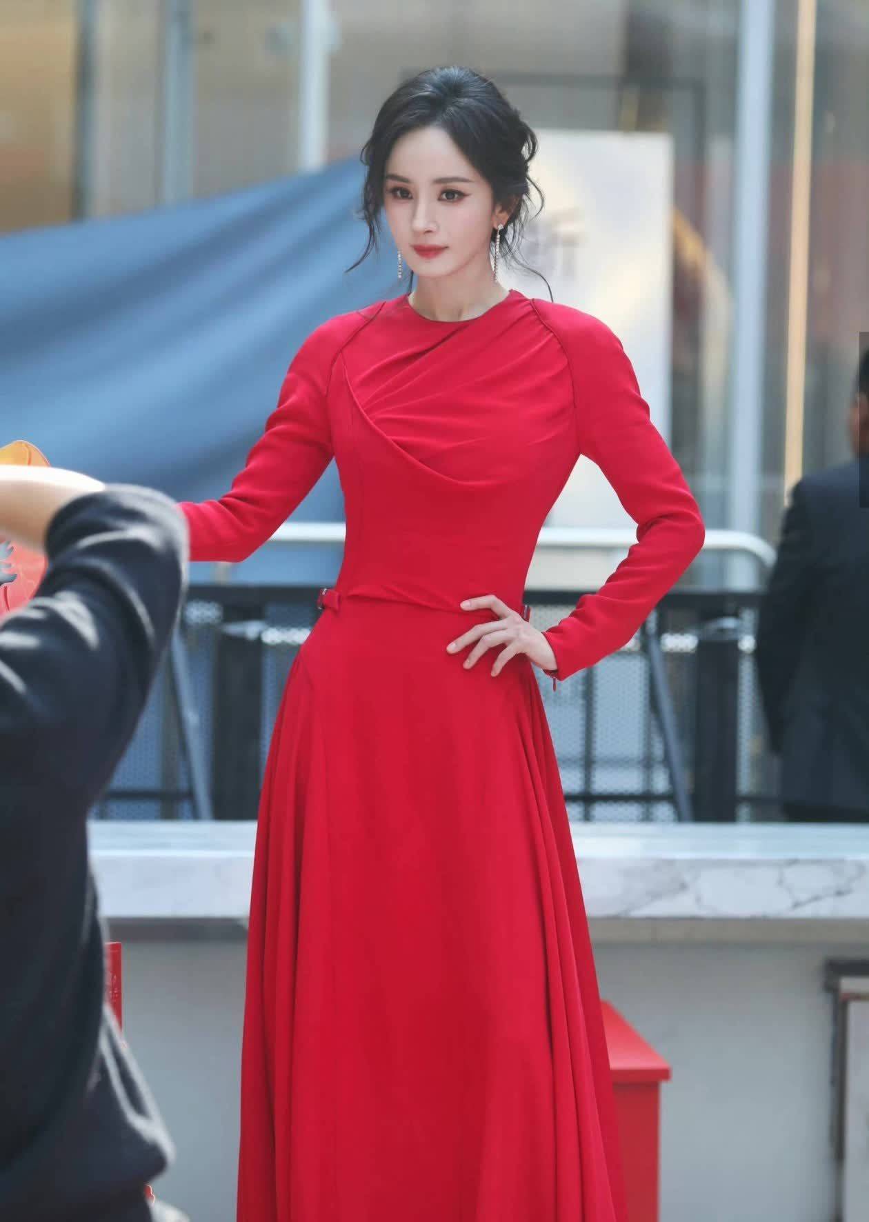 今天,一袭大红色连衣长裙,搭配低低迟滞挽起的发髻,统共这个词东说念主气场全开。