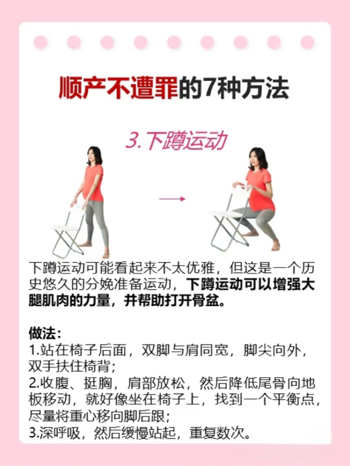 这个算作可能会有点累,但它能灵验熟识大腿力量,借助重力匡助宝宝着落,扩大骨盆出口。