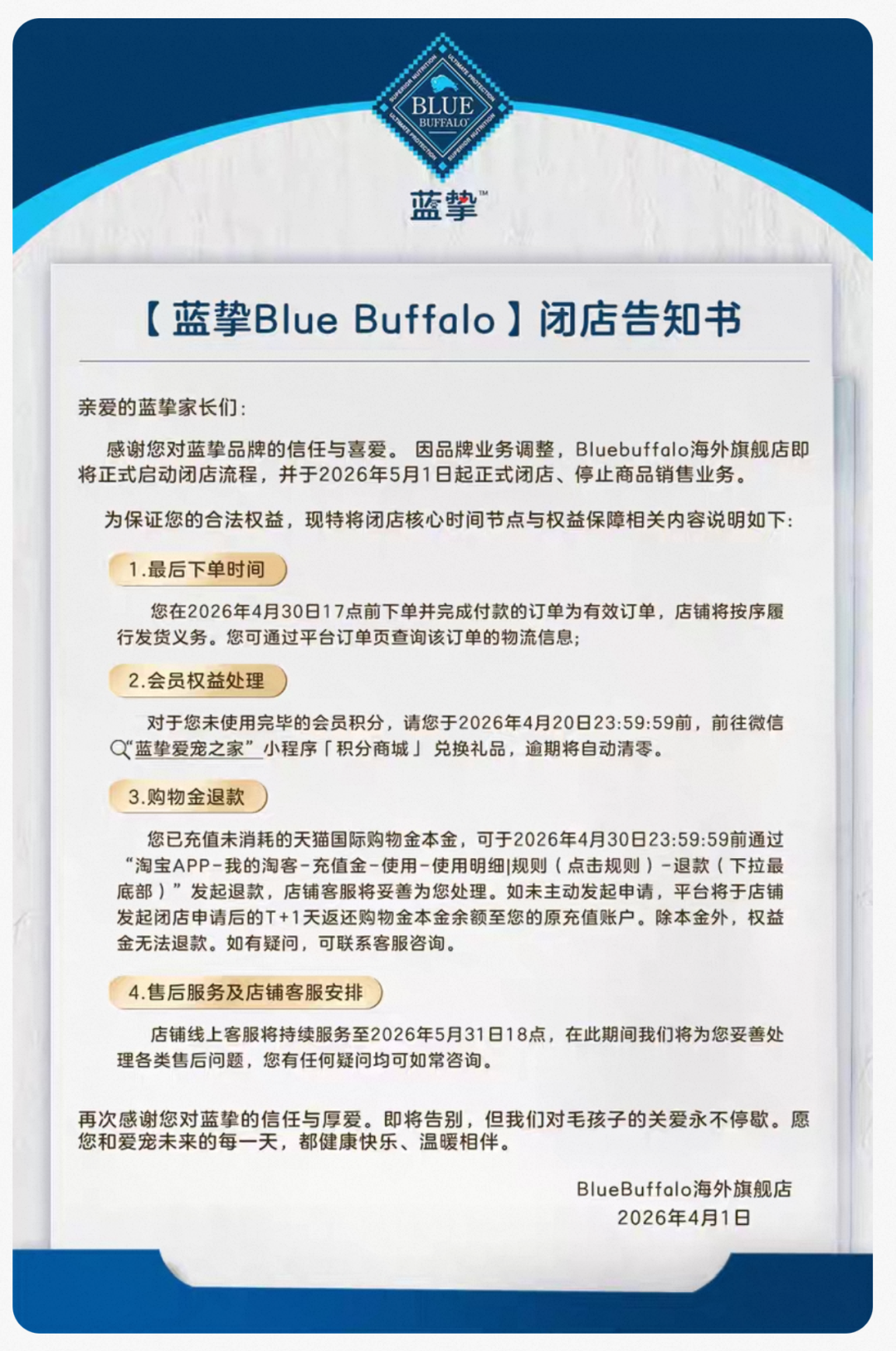 蓝挚的闭店示知书清晰,因品牌业务和洽,其Bluebuffalo国外旗舰店将于2026年5月1日起细密闭店并住手销售;2026年4月30日17点前付款的订单可正常发货,会员积分将在4月20日后清零,消费者可在期限前于微信“蓝挚爱宠之家”小措施兑换完毕。