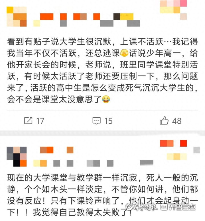 在允浩看来,这事儿弗周密怪学生,可能是从小上课养成的习气,大学课堂的千里默不是一两天酿成的,“单从大学运行改,有点晚了。再加上有些课如实枯燥,学生提不起兴味。淳厚再若何教唆,也很难把东谈主拽追思。”
