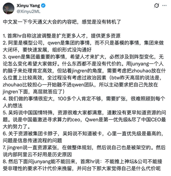 今天还流出一份吴妈给通义团队开会的摘录,信息量许多但不保真。