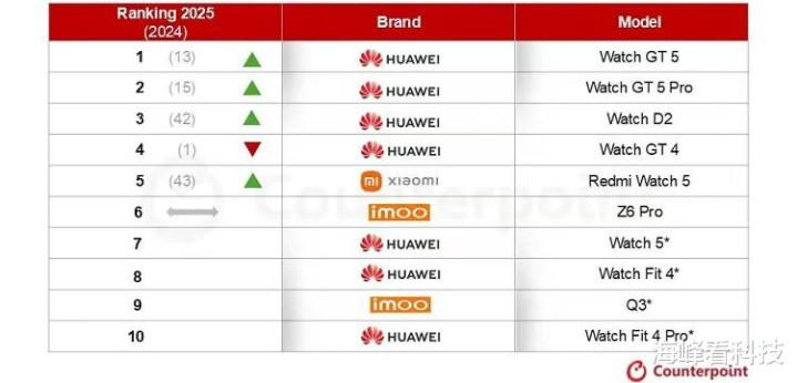 据Counterpoint Research发布的最新数据,2025年,华为在国内智高腕表市集取得了42%的份额,而单品销量前十的机型中,华为更是有7款腕表上榜,成为最大赢家。
