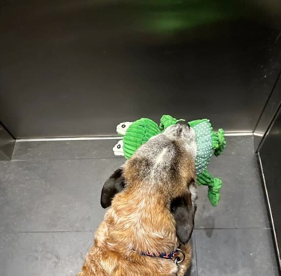 它超爱这个玩物,全程叼在嘴里,跟新主东说念主一齐来到了它的新家。