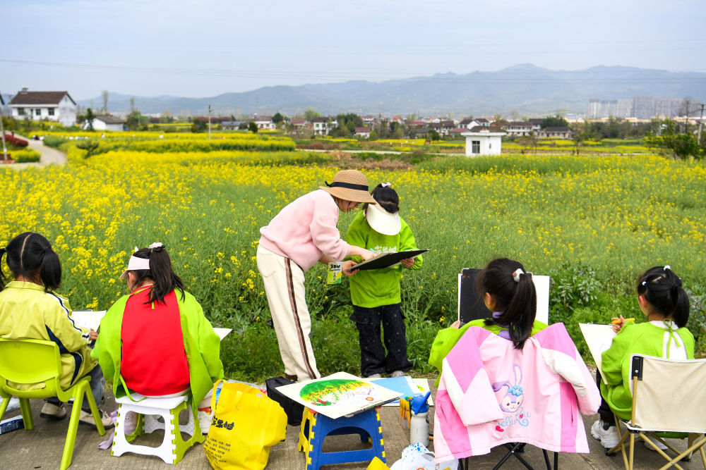 3月28日,学生在陕西省汉中市西乡县杨河镇高土坝社区油菜花不雅花点研学。新华社记者邹竞一 摄