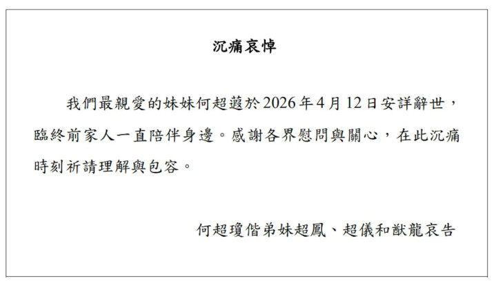 4月12日,澳门“赌王”何鸿燊女儿何超琼发布讣告,其妹妹何超蕸于2026年4月12日放心在世,临终前家东说念主一直奉陪身边。